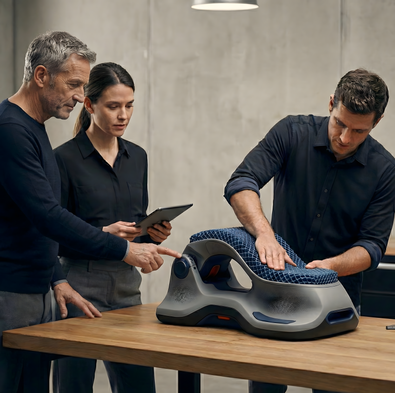 Elle intègre une approche scientifique, ergonomique et biomécanique afin de développer des solutions réellement adaptées au corps humain.